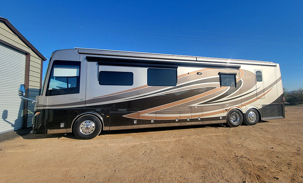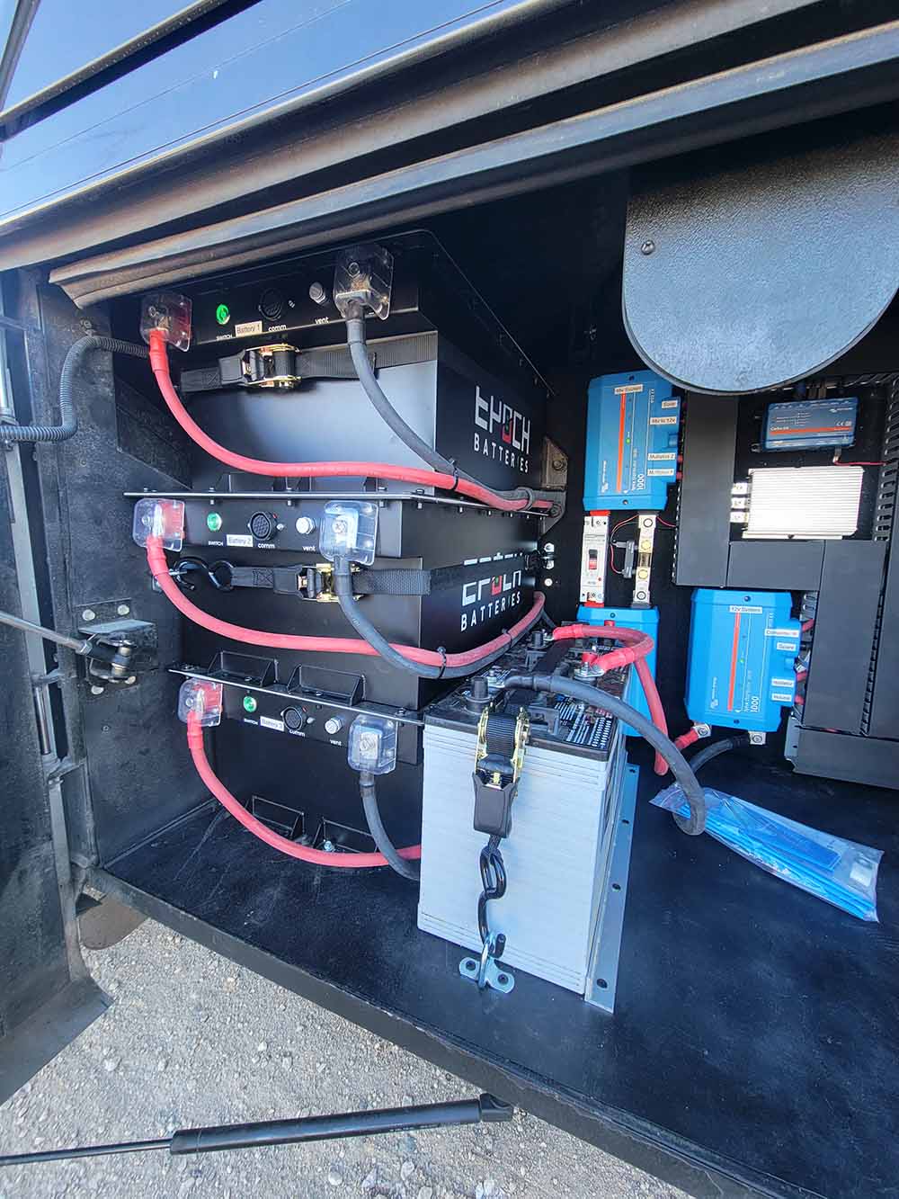 The owner of this luxury coach had a clear goal: the ability to run dual A/C units and a high-draw Starlink setup anywhere in the country—without ever touching a generator or hunting for shore power. Most factory systems aren’t designed to handle the continuous 120V loads required for a modern remote office and climate control. We needed to engineer a system that could produce massive power while fitting into existing storage bays without compromising the rig’s structural integrity.