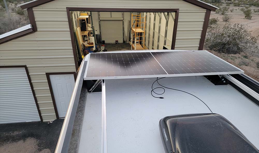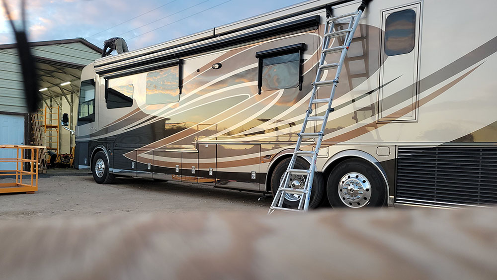 The crown jewel of this build is the 5,500W solar array. To protect the coach, we engineered a custom mounting solution using the existing awning brackets—achieving record-breaking solar capacity with zero additional roof penetrations.